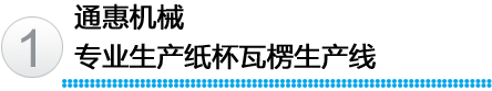 江陰市通惠機(jī)械有限公司,專(zhuān)業(yè)生產(chǎn)紙杯瓦楞生產(chǎn)線(xiàn),研發(fā)的中空紙杯專(zhuān)用瓦楞杯生產(chǎn)線(xiàn),S楞、菱形、圓形、點(diǎn)狀形瓦楞紙杯專(zhuān)用生產(chǎn)線(xiàn)。同時(shí),還生產(chǎn)單面瓦楞紙板生產(chǎn)線(xiàn)。